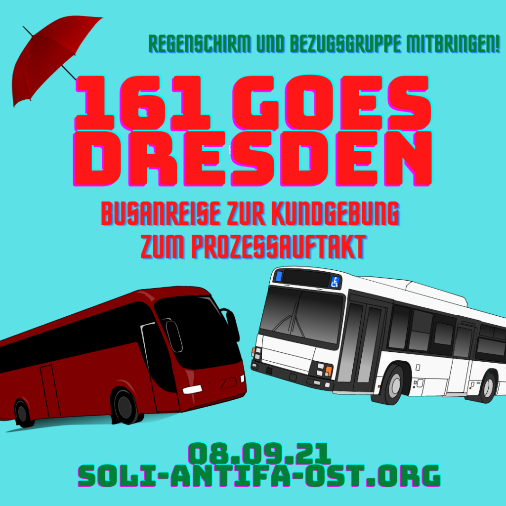 Trotz alledem – Für einen konsequenten Antifaschismus: Unter diesem Motto möchten wir den Angeklagten unsere Solidarität zeigen und den antifaschistischen Zusammenhalt bestärken. Aus Leipzig wird es eine Busanreise geben. Dort starten wir um um 5:30 Uhr um pünktlich um 7:00 Uhr vor Ort zu sein. Tickets für den Bus können für 10 Euro in den Buchhandlungen Drift und El Libro erworben werden.